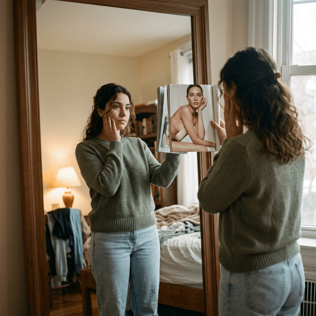 El problema no es solo estético, sino psicológico. La comparación constante puede provocar inseguridad con el propio cuerpo, vergüenza o rechazo hacia uno mismo, obsesión con la apariencia, conductas poco saludables para cambiar el físico, incluso ansiedad o tristeza al mirarse al espejo.